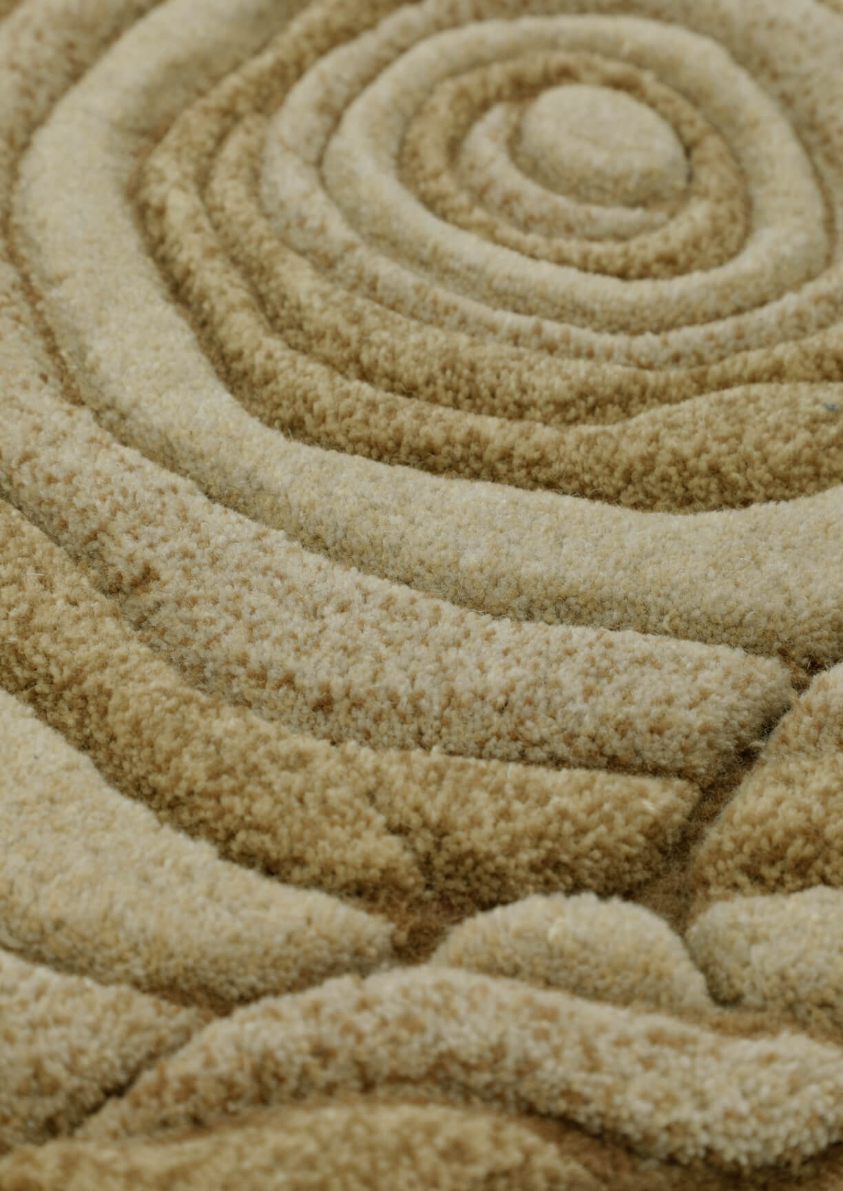 Stump Linen / Harvest Rug : Harvest/Linen conjures the coziness of golden fields and woods bathed in sunlight. Hand-carved with a sculptural high-low cut pile and inspired by tree rings, this pattern embodies organic beauty in a contemporary shape. It adds classic texture and subtle richness to any space because it is hand-tufted from 100% natural wool.