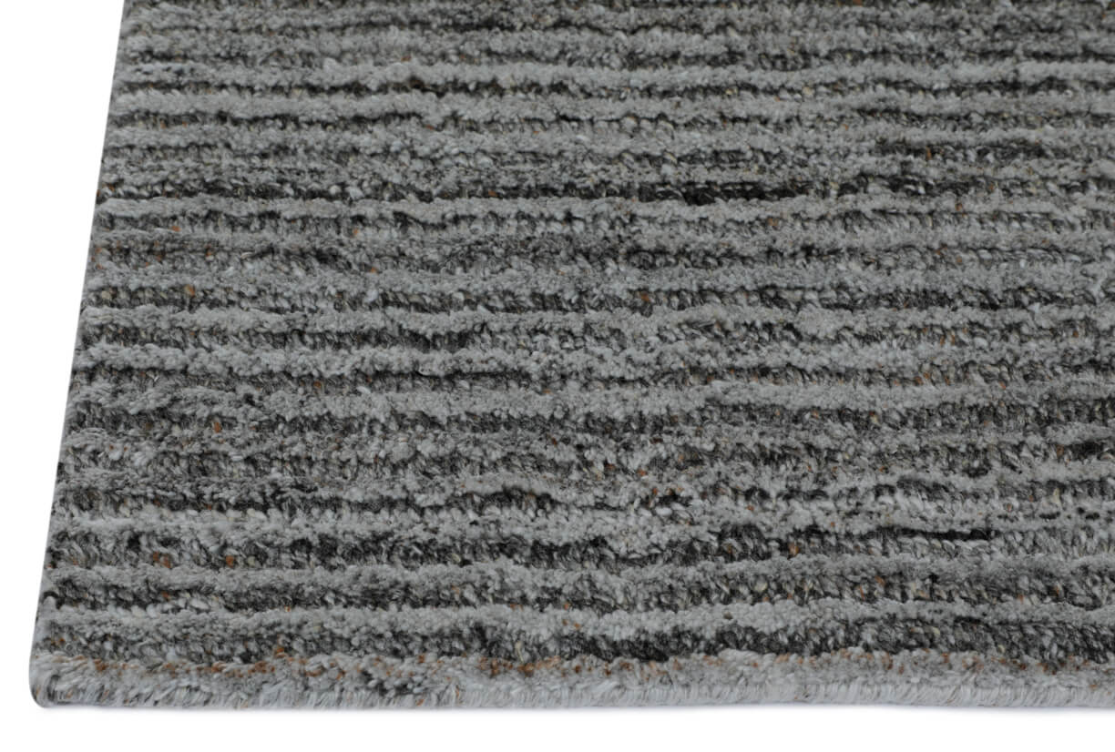 Voss Slate / Carbon : The Voss rug stands out in the rich, somber shades of Slate / Carbon. Using a cut and loop pile, the high-low striped design adds striking depth and dynamic texture to modern spaces. This rug provides an opulent yet durable base for well-curated, contemporary environments since it is woven with sustainable PET yarn using a traditional loom knot process.